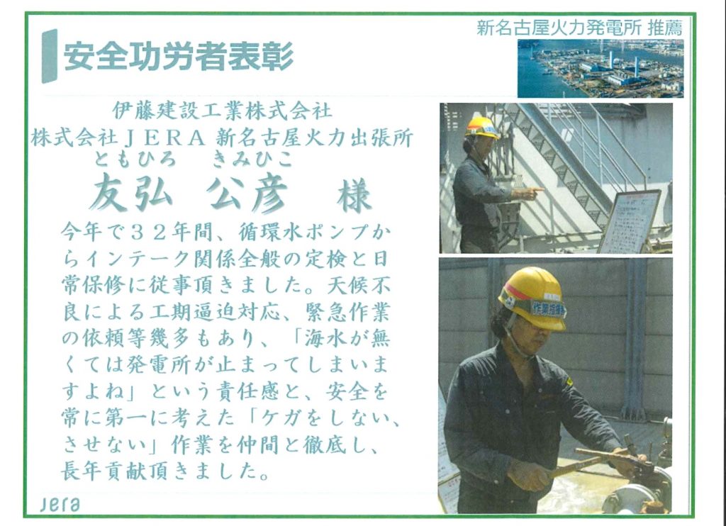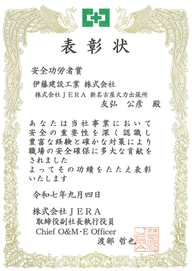 株式会社JERA 取締役副社長 執行役員より、プラント部の友弘公彦が安全功労者賞を拝受いたしました。